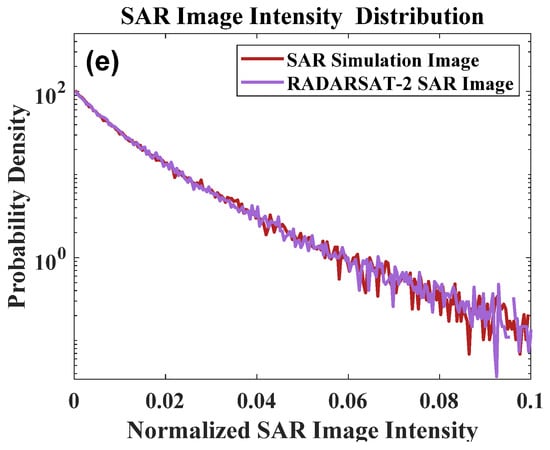 The comparison between the simulated and the actual SAR images. (a) The simulated HH-polarized SAR NRCS image; (b) the actual HH-polarized SAR NRCS images; (c) the image spectrum of the simulated SAR image; (d) the image spectrum of the actual SAR image; (e) the statistical probability density distribution of SAR image intensity.