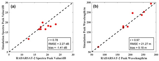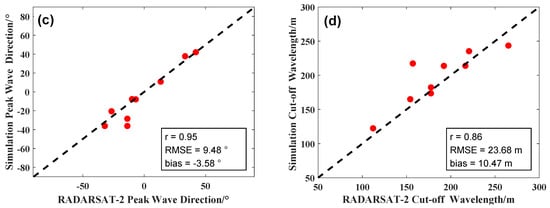 Scatter plots between the parameters obtained from the simulated SAR image spectra and those obtained from the RADARSAT-2 SAR image spectra. (a) The maximum spectral density; (b) the wavelength; (c) the propagation direction of the dominant wave; (d) the azimuthal cut-off wavelength. The dotted lines are diagonal lines for reference.
