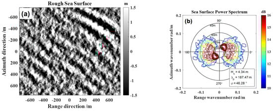 where z and  denote the profile and the slope of the sea surface, respectively, and , , and  represent the velocity components of the orbital velocity along the x-axis, y-axis, and z-axis, respectively.  and ;  and  are the discrete numbers of the surface along the range and azimuth directions, respectively; , , and  and  are the sampling intervals.  is slow time.  and  denote the widths of the simulated sea surface;  and  represent the spatial wavenumber of sea waves along the range and azimuth directions, respectively.  is the angular frequency with .  is the gravitational acceleration, and  denotes the Fourier coefficient of the rough sea surface, which can be expressed as