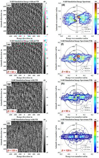 The simulated sea surface profile and corresponding SAR images with different β values. (a) The sea surface profile; (b) corresponding sea surface power spectrum; (c) , (e) , (g) , and (i) ; (d,f,h,j) are the corresponding SAR image spectra.