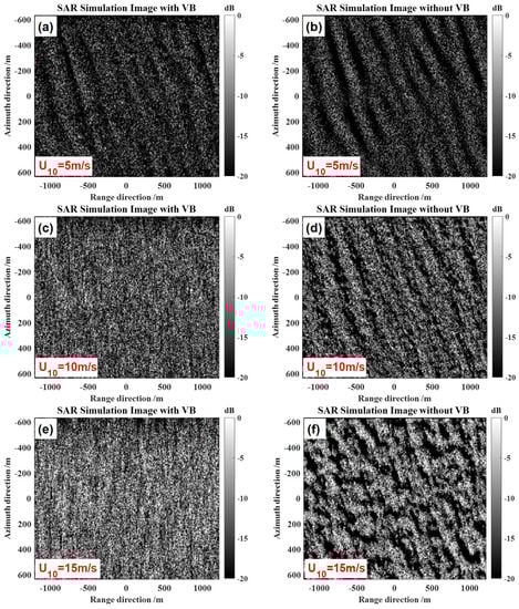 The SAR simulation images with the VB effect at different wind speeds: (a) , (c) , and (e) ; without the VB effect at different wind speeds: (b) , (d) , and (f) .