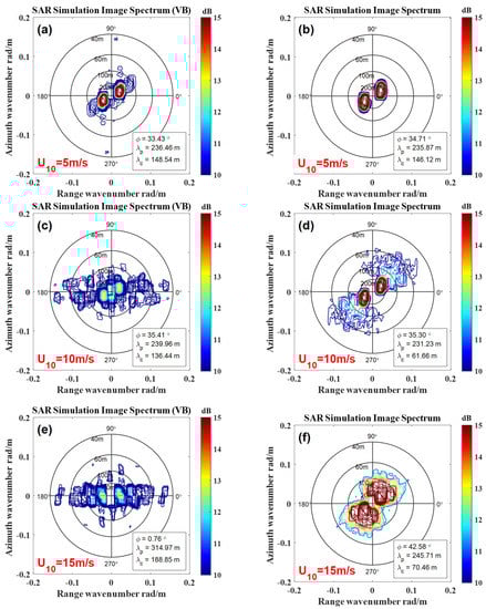 We discussed the influence of wind field because wind waves are directly determined by wind speed and wind direction. For different wind speeds and wind directions, the sea surface roughness and the orbital velocity of the wind waves would be significantly different. Then, wind speed and wind direction would induce remarkable influence on the SAR image. Figure 8 and Figure 9 show the influence of different wind speeds on SAR images and the corresponding SAR image spectra. The parameters used in the simulations are given in Table 4. Firstly, the comparisons of the simulated SAR images with and without the VB effect are shown in Figure 8. When the wind speed is 5 m/s, the radial velocity of the water waves is small, so the influence of the VB due to wind waves on the texture of the swell is not very significant. From the corresponding SAR image spectra shown in Figure 9a,b, the shapes of the spectral peaks of the SAR image spectra with and without considering the influence of VB effect are consistent with each other except for some differences in the spectral density. However, with the increase in wind speed, the influence of the wind waves on the texture of the swell becomes more obvious. Comparing Figure 8c,d, we can find that when the wind speed increases to 10 m/s, the textures of the swell in Figure 8c have been seriously smeared by the VB effect due to the orbital velocity of the wind waves. For this case, although the position of the spectral peak in Figure 9c is the same as in Figure 9d, the shape and the spectral density of the spectral peak have been changed significantly. Additionally, the spectral density of the SAR image spectrum with the VB effect is obviously lower than that without the VB effect. If the wind speed increases to 15 m/s, as shown in Figure 8e, the VB effect has made the textures of the swell completely invisible in the SAR image, only some stretched vertical stripes along the azimuth direction. From the corresponding SAR image spectrum shown in Figure 9e, we also find that the spectral peak has been rotated to the range direction. In addition, the azimuthal cut-off effect is more serious. From Figure 8 and Figure 9, we can find that if the influence of the VB effect has been considered, the information of the wind waves cannot be extracted from the simulated SAR images when wind direction is 60°.
