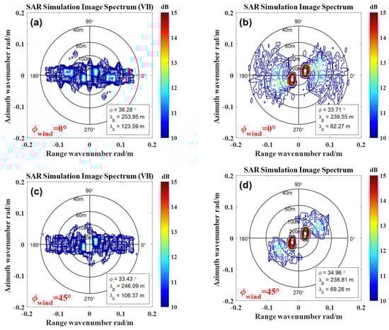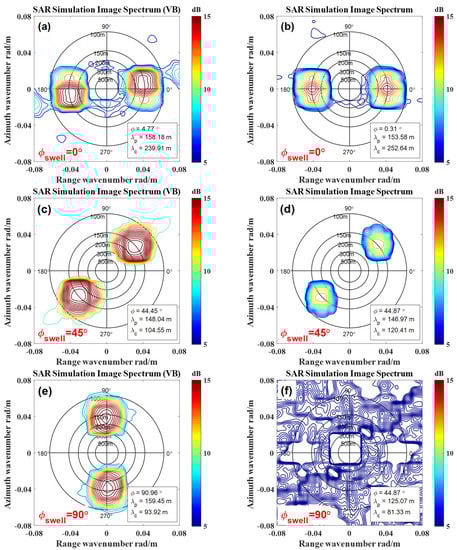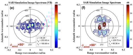 Figure 13 shows the SAR image spectra corresponding to the SAR images in Figure 12. The results show that the VB effect of different swell propagation directions has little effect on the spectral characteristics of SAR images. Especially for swells that travel over the range direction, the azimuth displacement always occurs at the front wave face or the rear wave face, so there will be no significant shift in the position of the ocean wave, as shown in Figure 12a,b. The azimuthal cut-off wavelength of the swell propagating along the range direction (0°) is 239.91 m when considering the VB effect. It is almost equal to the cut-off wavelength when the VB effect is not considered. Likewise, the peak wave direction is almost consistent. In addition, for the swell traveling in the azimuth direction, the wave component distribution in the SAR image spectrum is scattered in Figure 13f. On the other hand, the VB effect will make the swell characteristics more obvious, as shown in Figure 13e. Moreover, the cut-off wavelength is smaller than that of other directions.