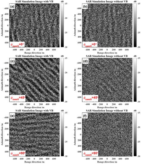 The SAR simulation images with the VB effect at different swell direction: (a) , (c) , and (e) ; without the VB effect at different swell direction: (b) , (d) , and (f) .