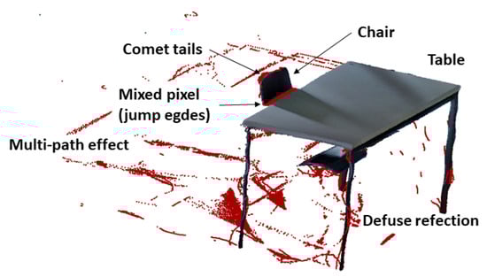Examples of objects (chair and table) and scanning artifacts in a point cloud. Common scanning artifacts are: comet tails, mixed pixels on edges (jump edges), multi-path effects and defused reflections.