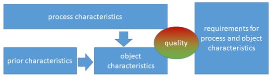 One approach to describe the quality is to use the ISO 9000:2015 (3.6.2) [] and DIN 55350:2020 []. Here, quality is defined as the “degree to which a set of inherent characteristics of an object fulfills requirements” []. The point cloud and the segmentation processes are the subjects of investigation, whose quality characteristics should be fulfilled to a certain degree. The characteristics can be expressed by quality parameters. Thus, the quality is a simple comparison of the actual and required quality parameter values of an object. ISO 9000:2015 also defines quality for the process of creation, so that process characteristics are required as well. Besides the process (segmentation) characteristic, there are characteristics that are affected by previous steps, such as capturing, and this influences the final object characteristics (semantic point cloud). This interaction is shown in Figure 3. The prior characteristics are derived from the acquisition method and must meet a minimum standard. Only if the minimum standard is fulfilled can the actual processing step be performed. The unprocessed point cloud must have a minimum resolution and fulfill a certain geometric level of accuracy (LoA). A suitable scheme to define the geometric LoA is provided by DIN18710:2010 []. The prior and the process characteristics influence the new object’s characteristics.