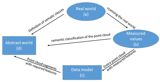 A process description outlines the individual steps that are to be implemented. Thereby, goals (tasks), data, definitions, tools and framework conditions are addressed. Point clouds belong to the group of geodata, so that a process description based on the model for geodata [] is chosen. The point cloud semantic segmentation process is shown in Figure 4. It consists of the object in the real world, two models (c and d), the data (b) and an action statement describing the interaction.