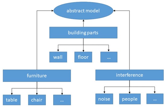 The optimal abstract model contains all possible classes. This is not possible due to the wide range of applications for point clouds. In Figure 5, a two-level model is shown, where only classes (or objects) are considered that are in a building. It would be too specific for modeling an entire building, since no external objects are included. In turn, for modeling parts of a building, this model is too general, because, in such a model, furniture and disturbances are not included. The advantage of a detailed model is that classes that are not needed are simply ignored. This favors a general model. A possible way to build a universal model would be to refer to the linguistic model WordNet [], as it is already the basis for ShapeNet [] as well as others. All nouns are attributed to the word entity. Starting from the entity, top-level nouns are formed, which can be distinguished in any direction. An application-independent hierarchic abstract model can thus be built. WordNet also has the advantage that cross-connections between hierarchical classes are possible and it has a directing effect for the creation of specific abstract models.