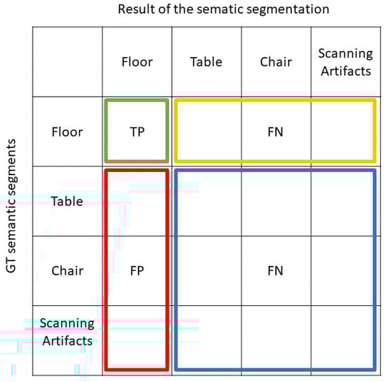 For the digital processing of point clouds, semantic information has to be given to the point cloud to form semantic segments. The initial semantic segmentation is always performed by humans. For this purpose, different tools can be used to form segments as efficiently, reliably, precisely and correctly as possible and to assign the correct semantic label. The efficiency, reliability, precision and correctness of semantic segmentation are characteristics that describe the quality of a semantic point cloud. These characteristics build the quality model, which describes how well the creation of the semantic point cloud works. Evaluation metrics now become parameters of the quality model, which describe the point cloud characteristics. A comparison of different segmentations is possible with the quality parameter. Method comparisons are common in automatic semantic segmentation [,,,], which typically uses machine learning (ML) and artificial intelligence (AI). For method comparisons, point cloud benchmarks are used [,]. Semantic point cloud benchmarks are point clouds for which a semantic ground truth (GT) is given. It is assumed that the GT point clouds are free of semantic and geometric errors. However, unfortunately, in most cases, a complete evaluation of the manually or semi-automatically created semantic point cloud benchmarks is not performed. The characteristics of a semantic point cloud that can be evaluated vary strongly among the published point clouds. In some works, the semantic accuracy of a point cloud is evaluated completely [] or by spot checks [,]. Other works evaluate only the completeness and correctness of a building model []. Even if some characteristics of the point cloud can be evaluated, then a comparison of the evaluation metric is often not possible, since no uniform metrics are defined. For example, intersection over union (IoU), F1-score, overall accuracy, recall, precision and many others are used to validate the accuracy. The variety problem of the evaluation metric for the case of object detection in images is well known and a tool to translate the evaluation metrics for compression was developed [].