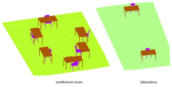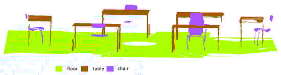 A major research topic in geodesy is to digitize activities in construction [,,], in building maintenance [,] and in navigation [,]. For the digitization of these tasks, digital building parts and furnishing objects must be formed and processed. Digital models of real-world buildings (digital twins) are needed to make complex and large semantic data interpretable for humans and machines []. The creation of digital twins is often based on 3D point clouds, which are efficiently captured with depth imaging cameras or light imaging, detection and ranging (LIDAR) systems. The 3D point cloud without any semantic features can already be considered a model, since humans can use their knowledge to interpret semantic point groups as single objects. These semantic point groups are, e.g., the objects and scanning artifacts, as shown in Figure 1.