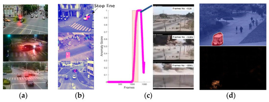 Snapshots of certain specialized strategies for identifying anomalies in a summarized manner. The images are taken from [43]. (a) Motion Interaction Field (MIF) [38] accident detection. (b) The topic-based model anomaly detection [44]. A car that has crossed the stop line appears on top of the row, a middle row is a hybrid, and a vehicle taking an odd turn is on the bottom of the row. (c) Multi-instance learning (MIL) anomaly detection in the real-time example [45]. The use of an anomaly ranking determines the detection of anomalies. (d) A vehicle on a walkway is identified with the STAN method [46]: as the top row is generator anomaly visualization, and the lower row represents the discriminator’s anomaly visualization [47].
