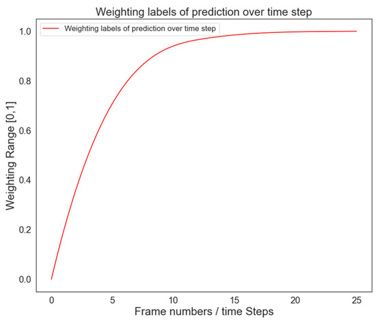 The encoder is composed of two ConvLSTM layers that convert the input into class probabilities. The decoder is made up of transposed convolution layers that upsample and transform the classes back to the image features, which later feed back into the top-down. The classification unit makes a prediction at each in-coming frame. A weighted sum of these prediction scores is calculated and passed through the softmax function to get predicted class probability. In the first few frames of the video, the model does not have enough context to make any meaningful predictions and therefore the weighting over time is performed by using an exponential function, as shown as Figure 5. Notice how predictions in the first few frames are weighted low while weights for later predictions stabilize at 1.0.