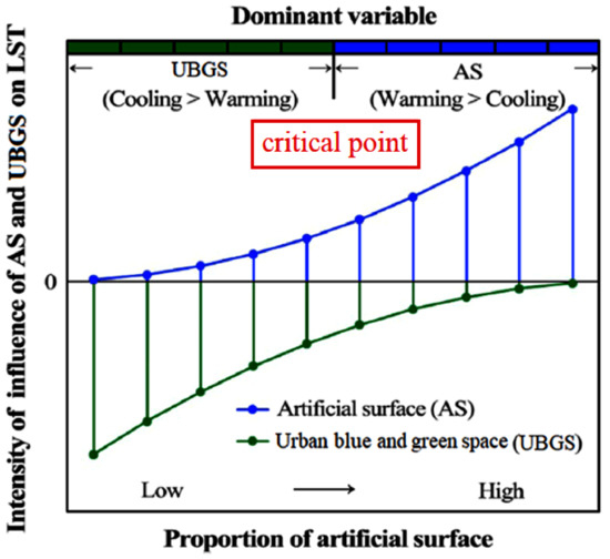 - There is indeed a critical point in the proportional gradient of UBGS in each city. When the proportion of UBGS exceeds this value, UBGS will substitute AS and become the leading variable in LST, causing a cooling effect; otherwise, AS will dominate LST, resulting in a warming effect.