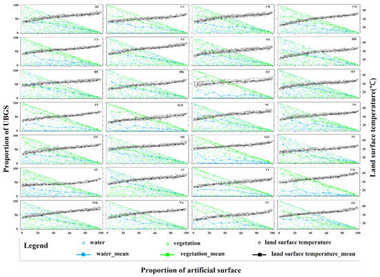 where is the coefficient of UBGS (water or vegetation), is the coefficient of AS, and is the intercept of group no. ( = I, II, ……, X). Here, the regression coefficient estimates the extent of the impact of UBGS and AS on LST. On the premise of the conceptual graph in Figure 1, when the proportion of AS is low (e.g., Group I, no. n), if > , ……, > , UBGS is considered to be the dominant variable. Otherwise, when the proportion of AS is high (e.g., group no. (n + 1), no. X), if < , ……, < , AS is viewed as the dominant variable. In this vein, 10*N% is the critical point of the competitive effect of AS and UBGS on LST within the city.