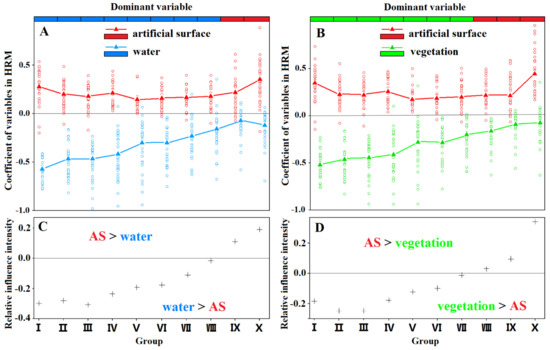 Furthermore, we established regression models for each group. The proportion of UBGS (water or vegetation) to AS of the grid cells in each group was taken as the independent variable, while the average LST was taken as the dependent variable, and the variable with the largest regression coefficient was viewed as the dominant variable influencing the LST of the group. Since each grid contains three types of land cover, AS, water, and vegetation, there was a multicollinearity phenomenon when their proportions were included in the regression model together. To alleviate this problem, we used the hierarchical regression model (HRM) [71] by adjusting the third independent variable, and examined the AS–water–LST and AS–vegetation–LST relationships.