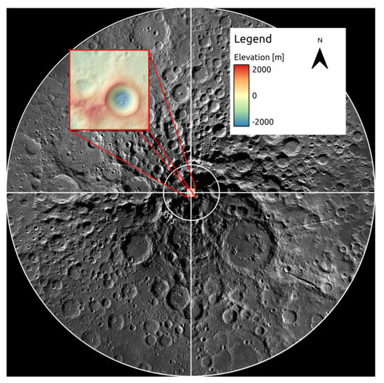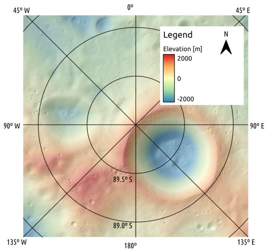 In our study, we use a DTM provided by Gläser et al. [48] generated from Lunar Orbiter Laser Altimeter (LOLA) data (Figure 3). The DTM was co-registered using optical data from LROC NAC, has a resolution of 20 m per pixel, and covers the area from −88.5° to −90° S. We use the DTM to identify PSRs based on illumination conditions and digitize impact craters based on topography information.