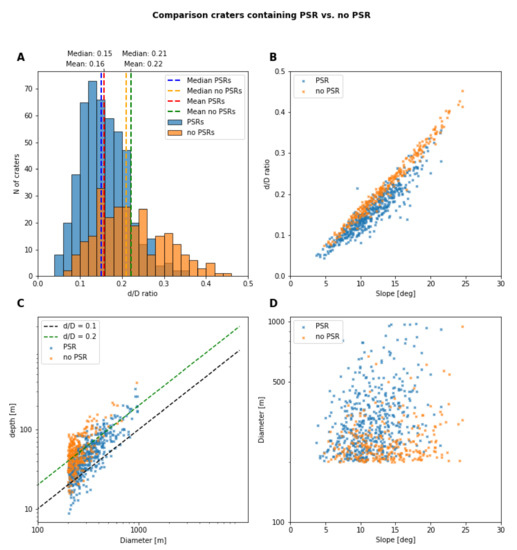 Comparison of craters containing PSRs and without PSRs. (A) Histogram of all d/D values measured within our RoI. Craters with PSRs in their interior are shown in blue with a peak around 0.16. Craters without PSRs are shown in orange with a peak at 0.22. (B) Average slopes and d/D ratio seem to show a strong correlation between wall slope and d/D ratio where the deepest craters have the steepest slopes. Craters with PSR tend to accumulate in the area with a low d/D ratio and low slope. (C) The average ratio for craters containing PSRs is approximately 0.1 which appears to be of an older age in comparison with the craters without PSRs. (D) Average slopes with respect to the diameter of the craters. Craters containing PSRs are normally characterized by low slope walls even for larger diameters, making them shallower. Craters with no PSRs are on average smaller in diameters but contain steeper slopes.