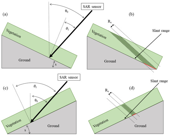 Effect of steep slopes on InSAR signal. (a) Where slopes face towards the sensor, the local incidence angle becomes small. (b) Considering the range resolution of the sensor , each resolution cell contains an excessive volume of vegetation and an extended area of ground, leading to poor angular coherence in the scattered signal. The opposite case is shown in (c) where the slope faces away from the sensor, leading to large . (d) For the same , fewer scattering components are present in each resolution cell.