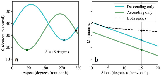 Analysis of local incidence angle as a function of pass direction, slope (S) and aspect, as given by Equation (7). For our TDX scene, and . (a) For a given steepness of slope, varies with the cosine of aspect. As is close to 180, the curves for the two pass directions are highly out of phase. (b) The minimum possible is shown as a function of terrain slope for each pass, and for the case where pass is chosen flexibly. The dots highlight the corresponding points between the two graphs, which share the same y-axis.