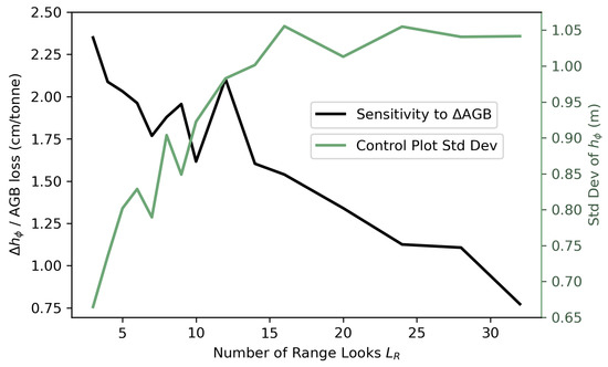 (black, left hand y-axis) Modeled drop in phase height () in cm per Mg of AGB loss, calculated for various levels of multilooking. (green, right hand y-axis) Standard deviation of for the 11 control plots, plotted against multilooking level.