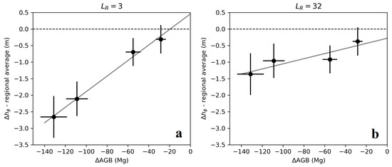 However, changes at the pixel level will occur for a number of reasons, including variations in sensor geometry and movement of scatterers in the canopy. For this reason, it seems desirable to use a large number of multilooks in order to average out these variations. Previous studies examined phase changes at a scale of 50 m [26,27]. On the other hand, it is important to recognise that variations in are related to the vertical structure of tropical forest, rather than being simply ‘noise’, meaning that spatial averaging risks the loss of useful information [57]. The X-band signal is able to penetrate through small gaps, resulting in a few-look distribution that correlates strongly with forest height [28]. Our first analysis, therefore, was to compare relationships between and AGB from selective logging at different levels of multilooking, to determine the optimal level for quantification of biomass change. It should be noted here that by multilooking, we specifically refer to spatial averaging of the complex radar signal, as opposed to spatial averaging of , which was performed in all cases.