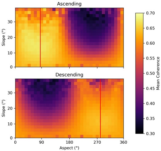 Heat map of average coherence for 30 m TDX pixels binned by SRTM slope steepness and aspect for an ascending pass and a descending pass. Red lines indicate the azimuth direction for each pass, which represents the aspect at which slopes face away from the sensor.