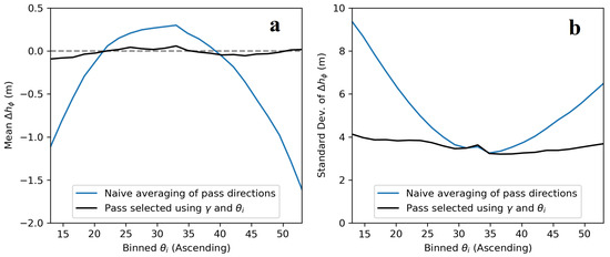 Overall we found the pass selection method to be highly successful in removing any relationship between observed and local incidence angle. In the overlapping region between the TDX passes, pass selection produced values of that were effectively not biased by topography at all, with no change in (Figure 9a) or its standard deviation (Figure 9b) as varies. This is in contrast to the case where both pass directions are averaged; using this method, regions of strong slopes showed large decreases in and large variability.