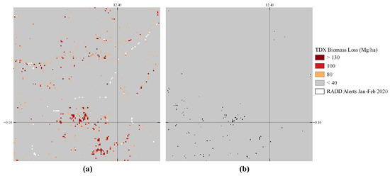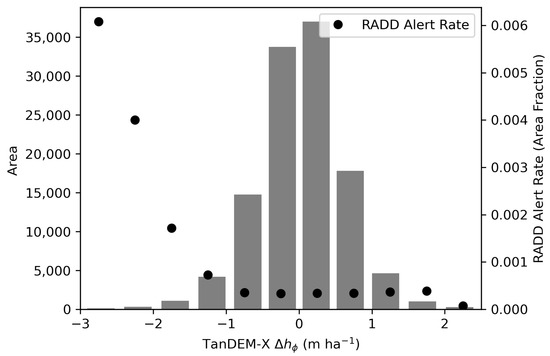 As expected, the UMD product detects much less disturbance than the radar products, as it is cloud limited and operates at too coarse a pixel size (30 m) to quantify selective logging. Our method using TDX appears to detect much more widespread forest disturbance than the RADD alerts, and this ratio is dependent on the temporal accuracy of the RADD alert dates (which is unknown) and the phase height decrease that is defined in this scenario as a disturbance. This comparison is somewhat limited by the fact that the TDX data use the statistics of a region to estimate a continuous variable (biomass loss), while the UMD and RADD systems work by classifying individual pixels as either disturbed or undisturbed. Nevertheless, it is clear that TDX phase height could have the potential to reveal lower intensities of forest degradation than these products if the false alarm rate is properly quantified.