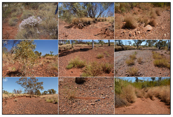 Vegetation found within the headwater channels in the Pilbara region: (a) cotton bush (Ptilotus obovatus) and hard spinifex (Triodia lanigera), (b) LWD in a cobble substrate, (c) soft spinifex and buffel grass in a cobble bed, (d) young tree, (e) small shrubs and fine sediment in a cobble channel, (f) vegetation in a cobble substrate, (g) eucalyptus tree surrounded by soft spinifex, (h) narrow ridge-bar, (i) highly vegetated sand-bed channel.