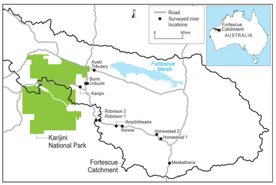 Map of surveyed channels in the Upper Fortescue Catchment, in the Pilbara, Western Australia.