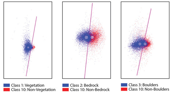 Semi-supervised classifier training result for identified features within natural channels. Data are projected in the plain of maximal separability and the spheres represent each class in the plane of maximal separability. The classification boundary is represented by magenta line and the core points extracted from the point cloud are shown. Greater point mixing between this line indicates a poorer performing classifier file. Class 1 shows vegetation and non-vegetation, a strong performing classifier file with little overlap between the classification boundary.