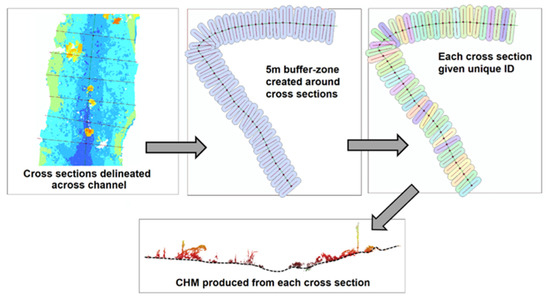 Canopy height models (CHMs) were produced for each surveyed river reach to provide an accurate representation of vegetation within and surrounding the river channels. Each surveyed site was divided into equal segments representing a 10 m stretch of channel. Cross sections were delineated digitally across each channel at a 10 m spacing. A 5 m buffer zone was created around each cross section using the ArcMap Buffer function. The point cloud file was then extracted from each buffer zone to create an individual plot cross section. Each cross section was provided a unique plot ID number. A dataset of 750 cross sections was derived from the point clouds. Ground points were delineated for the point clouds and points above the ground surface were calculated and normalised using LAStools using LasGround and LasHeight [48]. Individual CHMs were produced for each cross section using the LAScanopy tool from LAStools. LAScanopy is a tool that computes common forestry metrics from height normalised point clouds [48]. CHMs were produced for vegetation above 0.1 m and canopy metrics (max, min, standard deviation, and density) were obtained for each cross section. Figure 5 shows this procedure. The CHMs were used to assess the contribution of vegetation to total channel roughness.