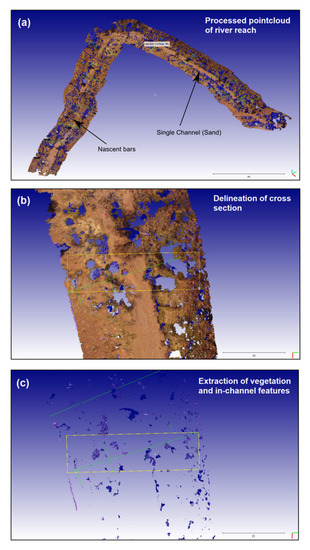 Illustration showing the point cloud processing steps for the estimation of the contribution of vegetation to channel roughness (using an equation from Petryk and Bosmajian, 1975). (a) shows a processed poincloud of the river reach with geomorphic features identified, (b) highlights the delineation of cross section and (c) shows the extraction of vegetation along the cross section.