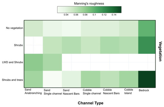 Heatmap to show the relative contribution of different vegetation classes to each of the seven channel types. Darker green indicates that a greater proportion of total roughness is derived from the respective vegetation type, lighter green indicates a smaller proportion of total roughness is derived from the respective vegetation class. White indicates no value, where the channel type and associated vegetation pattern was not observed.