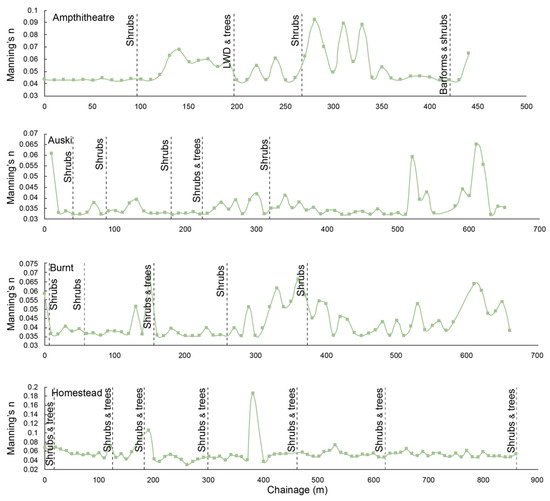 Longitudinal variations in channel roughness for selected channels.
