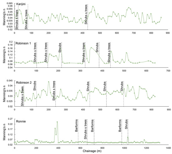 The derivation and selection of roughness values for natural channels usually requires considerable experience [10] with guidelines for headwater channel usually focusing on perennial river systems [11,12]. Roughness is commonly described by the Manning’s n-value. Manning’s n is a frictional loss coefficient that accounts for losses arising from the frictional resistance along the channel boundary, such as the effects of various roughness elements and small-scale irregularities of the boundary [13,14,15]. It is widely used in many hydrodynamic models to provide a roughness coefficient for conveyance estimation [15]. The presence and variation in material (e.g., sediment, vegetation, and geomorphic forms within the channel) contribute to the overall channel roughness within the river reach and help differentiate between channel types [16]. Dominant factors controlling flow resistance vary longitudinally along the channel network, and in many cases with discharge [16]. As such, many methods to estimate roughness include hydraulic characteristics of the river channel [14,17,18]; however, this is less suitable for the ephemeral rivers within the Pilbara, owing to the lack of streamflow records within the channels. Significant errors in the estimation of discharge can also occur, resulting in discrepancies among Manning’s n-values, particularly within low gradient, low roughness channels [19].