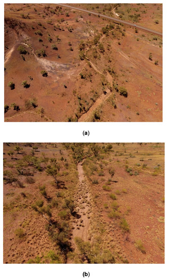 The hydraulic properties or boundary conditions in study reaches are commonly measured to derive Manning’s roughness values, and coefficients are calculated to cover a broad spectrum of river and stream types to represent the roughness variability in a particular study region [14]. A reference reach approach was used to capture the variability in Manning’s roughness conditions within natural headwater channels. A series of ten headwater channel reaches were surveyed using structure-from-motion (SfM) within the Upper Fortescue Catchment (Figure 2). The high resolution (centimetre level accuracy) point clouds produced for this remote area allow the precise measurement of channel dimensions, geomorphic features, and vegetation. A three-stage approach was undertaken: Firstly, a description of channel types was made using a semi-supervised classification of geomorphic features in 10 natural channels. Secondly, canopy height models (CHMs) were created to measure vegetation parameters in each cross section. Finally, the estimation of Manning’s n roughness contributions for these distinct channel types is made considering the boundary roughness of the channel (width, depth, and sedimentology) and the roughness contribution of in-channel vegetation. These steps are further described below.