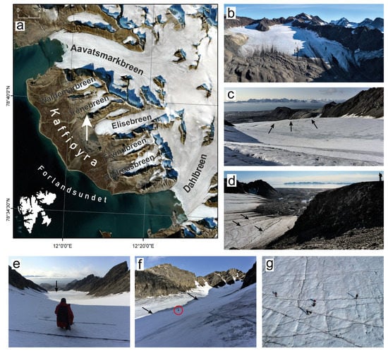 (a) Location of the study site in 2021; (b–f) Characteristics of the glacier surface in 2021. Black arrows in (c,e) show the main uplift in the glacier surface with the most prominent crevasses. Black arrows in (d) mark the main meandering supraglacial streams in the NW part of Irenebreen. Black arrows in (f) mark the outline of snow in the accumulation area in August that coincides well with the glacier area in shadow. A red circle shows a researcher to indicate a scale; (g) CMP measurements are being conducted. Note the cross-cutting pattern of crevasse traces and closed crevasses indicating compressional stress regime.