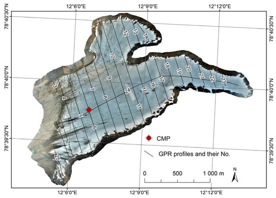 Various remote sensing methods are used for glacier volume and internal structure investigation (for review refer to []). Particularly detailed information about glacier internal structure can be obtained using ground-penetrating radar (GPR). Since the first attempts to apply GPR to glacier studies [] (pp. 4–6), a range of its application has been found [,,,,,,]. Observing that water inclusions in temperate ice causes intense scattering of GPR signal [,,] provided a powerful tool for detailed mapping of thermal structure of glaciers.