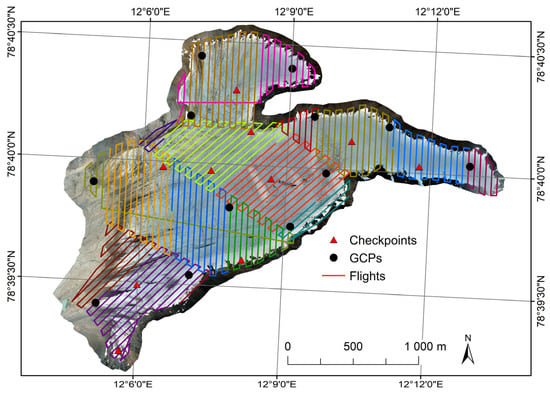 UAV survey on Irenebreen was carried out in 2 days—21–22 August 2021. Automatic mission flights were executed by DJI Phantom 4 RTK UAV platform. Mission planning was accomplished in DJI GS RTK software. In order to get constant ground sampling distance (GSD) within the flight, as well as minimize risks of collision, terrain following function was used. As a source of elevation data, the Arctic DEM was used. It was planned that the flight altitude would be 100 m above the Arctic DEM. Such flight altitude would result in 2.74 cm/pix GSD. Since the Arctic DEM was produced from older satellite images, the altitude of the glacier surface had changed. Thus, the real flight altitude was ~120–130 m above glacier surface. The GSD varied from 3.29 to 3.56 cm/pix. The mission was planned with 80% front and 60% side overlap. Recent imagery from Planet CubeSat class satellites was used for the mapping of the glacier outline. The resultant polygon was imported as KML file and used for mission extent. Mission planning was designed following authors experience in previous studies [,,,] and latest publications, related to Phantom 4 RTK UAV system [,,,].