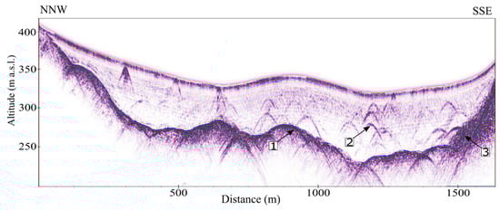 GPR profile 10. Note that the profile is unmigrated for better identification of hyperbolic reflections. For the location of the profile see Figure 2. 1—glacier bed; 2—englacial hyperbolic reflection; 3—zone of intense scattering.