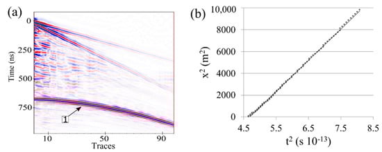 (a) During CMP measurements obtained radargram; (b) Constructed t2x2 graph.