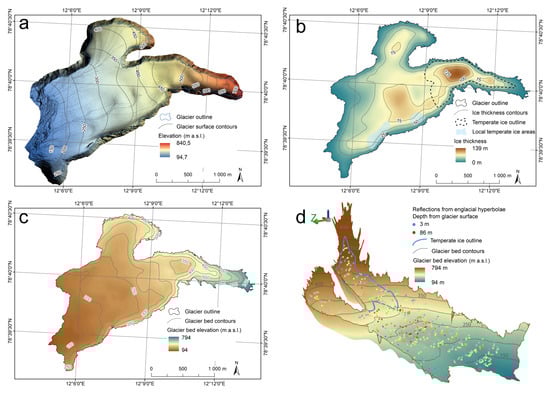 Considering that the average thickness of ice, solely in the area where the temperate ice is distributed, equals 73 m, the average temperate ice thickness is exactly two time less. Thus, the temperate ice layer on average occupies half of ice thickness in its distribution area, which is also well visible in Figure 8d. The maximal measured depth of the upper surface of the temperate ice layer (from the glacier surface) is 76 m, but the mean depth of the surface of the temperate ice layer is 43 m. The range of the altitude of the temperate ice surface stretches from 364 to 649 m a.s.l., although it could stretch slightly higher because the highest GPR profile begins some 200 m from the uppermost glacier margin, where the altitude of the glacier surface reach ~750 m a.s.l.