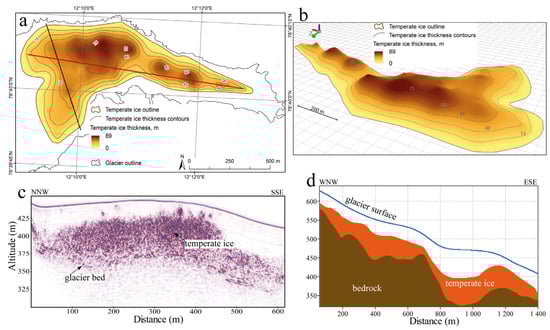 The area of the intense scattering zone that is located in the upper part of the glacier (accumulation area) occupies 0.46 km2. According to numerous studies where direct temperature measurements in boreholes were correlated with GPR survey results in attempts to explain such intense scattering [,,,,,,,], we interpret it as indication of temperate ice. The volume of temperate ice in Irenebreen equals to 16,950,676 m3 (0.017 km3). Considering the extent of the Irenebreen glacier (2.90 km2) and volume (0.14 km3), the horizontal distribution of the temperate ice is 16% but the volume reaches 12% of the total glacier volume. The average thickness of the temperate ice is 36.5 m, while its maximum thickness reaches 89 m in local subglacial deepening (Figure 8a,b), which also coincides with the thickest ice region (Figure 6b). Thus, the thickness of the temperate ice correlates very well with the thickness of all the glacier ice.
