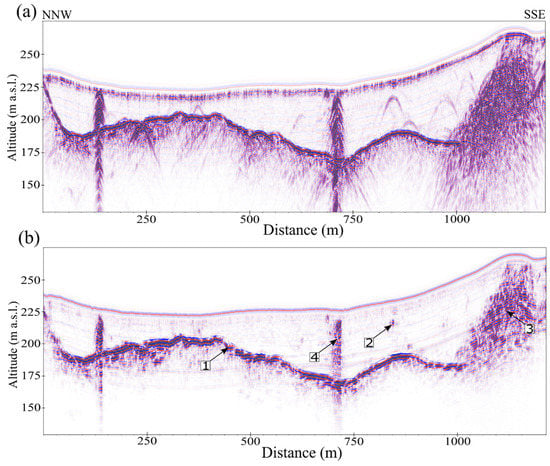 The GPR data were processed and interpreted with Prism 2.61 software following basic guidelines for GPR data processing [] (pp. 33–37). The processing steps included a manually adjusted time-dependent signal gain function, background removal filter, Ormsby band-pass filter with a low frequency cut off at 10 MHz and a high frequency cut off at 71 MHz, and migration [] (p. 36) using with the common midpoint method (CMP) determined GPR signal propagation speed. Topographical correction was performed using elevations from DEM, which was generated from UAV photogrammetry.