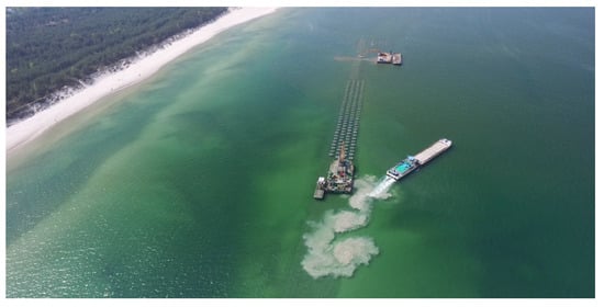 Therefore, frequent monitoring techniques are necessary to capture the variability of the surf zone and the impact of implementing protection solutions to enable in-depth and complete coastal analyses [13,17]. Topography acquisition is an extremely common approach that has been performed in a straightforward manner [18]. However, mapping changes during the construction of underwater protection projects in shallow coastal waters is generally expensive, and frequent surveying can pose a financial challenge for national coastal protection services. The conventional methods used in subtidal zones for underwater monitoring generally comprise either a vessel equipped with a hydroacoustic device [3,19] or video tools and other types of SCUBA-operated devices [20]. Here, we present new possibilities for cost-effective monitoring of underwater construction in the surf zone using unmanned aerial vehicles (UAVs).