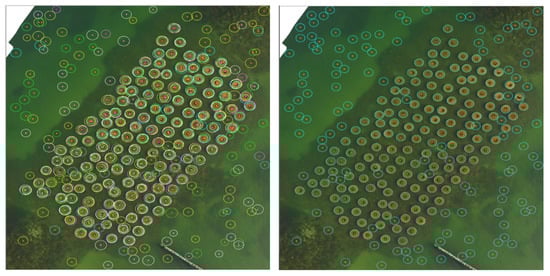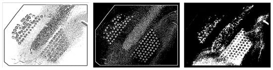 In this process, we detected the centers of circles that were significantly darker than their surroundings; the images were normalized to 0–255 and 8-bit representations and histogram equalization was performed according to global equalization criteria. The prepared images were segmented using adaptive thresholding. However, the images had to be blurred with a Gaussian mask of 15 × 15 pixels to smooth small objects that interrupted the threshold process. Prepared images were analyzed using a sequence of morphological opening and closing operations, with an ellipse of 5 × 5 pixels being used as a structuring element. This allowed us to find isolated contours (blobs) that satisfy the following conditions: a blob area with a larger range (600, 1400) and an aspect ratio of width to height in a specific range (0.8, 1.2). For each individual list of candidates, we integrated holes (candidates) that were closer than the distance equal to the radius by averaging their positions and removing duplicates (holes close to each other were removed by using radius as a criterion: Figure 11—left side).