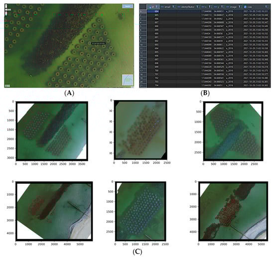 In the process of validating the algorithm, two qualified operators (specialists in the interpretation of remote sensing data of the coastal zone) independently identified the origin of the circles visible at the selected test site. In addition, a specially developed web-based program, based on the Leaflet Javascript library and accessible via a web browser, was used to benchmark the location recognition of individual infrastructure elements. This program works based on an algorithm and manual classification. A portal was created to allow multiple users (mostly senior students from various marine, geography, and computer science majors) to simultaneously enter identification points for the center of concrete circles. Each user, after registering, was given a random set of images with habitat modules from different years, and their task was to mark the centers of all circles visible in each image (Figure 12A). In this way, results were collected from approximately 40 additional operators who collectively marked over 25,000 points (Figure 12C). The resulting point coordinates were then stored in a PostgreSQL database (Figure 12B). The database allowed the rejection of significant outliers and averaged the data to centroids in the WGS84 system (EPSG:4326).