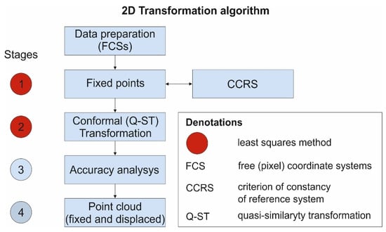 In the first stage of the 2D transformation (Figure 13), the criterion of points stability (reference datum) was determined. This criterion is defined as the uncertainty (mean error) of the point position after the transformation, not exceeding the double value of the standard deviation, which is described by Formula (1). This approach is applicable to the study of the deformation of engineering structures. The coordinates of the outlier points were not used to determine the coordinate transformation parameters, and these points were treated as moving and the displacement (deformation) values are determined for them [48,49].