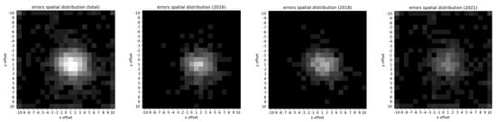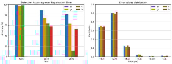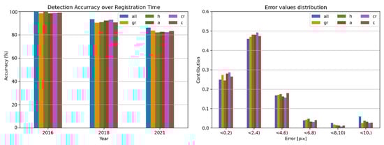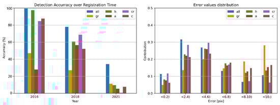 The overall detection accuracy (understood as a number of correctly detected objects in comparison to the actual ones) is equal to 0.987, varying for particular years (see Figure 13, left chart). According to the cumulative histogram of error distributions (Figure 13, right chart), the detection accuracy is quite high. The processing of all channels (“all”) instead of individual ones (”c”—cyan; “gr”—grayscale; “h”—HSV hue; “cr”—YCbCr chroma; “a”—Lab) gives the highest detection accuracy. The errors distribution for the cr channel is slightly better than for all the concatenated channels. Detection accuracy for all the channels is higher, which makes such an approach more sensible. The majority of the errors did not exceed 4 pixels, with an average of 4.06 and a median of 4.12 pixels. Pixel value has been presented here as a field pixel representation—GSD (ground sampling distance)—a value of 0.02 m. This is primarily because the operators marked the circle origins by considering the shadow inside the central part of the objects, whereas the algorithm detected the center on the two-dimensional projection of the three-dimensional structure. It can be observed on the spatial distribution plot (Figure 15), where the majority of errors are within offset (2.2). The closer look unveils that the accuracy for images taken in 2016 and 2018 is quite high. Moreover, the errors are kept in significantly low range. On the other hand, images taken in 2021 characterize lower accuracy and larger spread of errors distribution, since in these images have lower contrast coming from the fact that the underwater structures have been covered by sand.